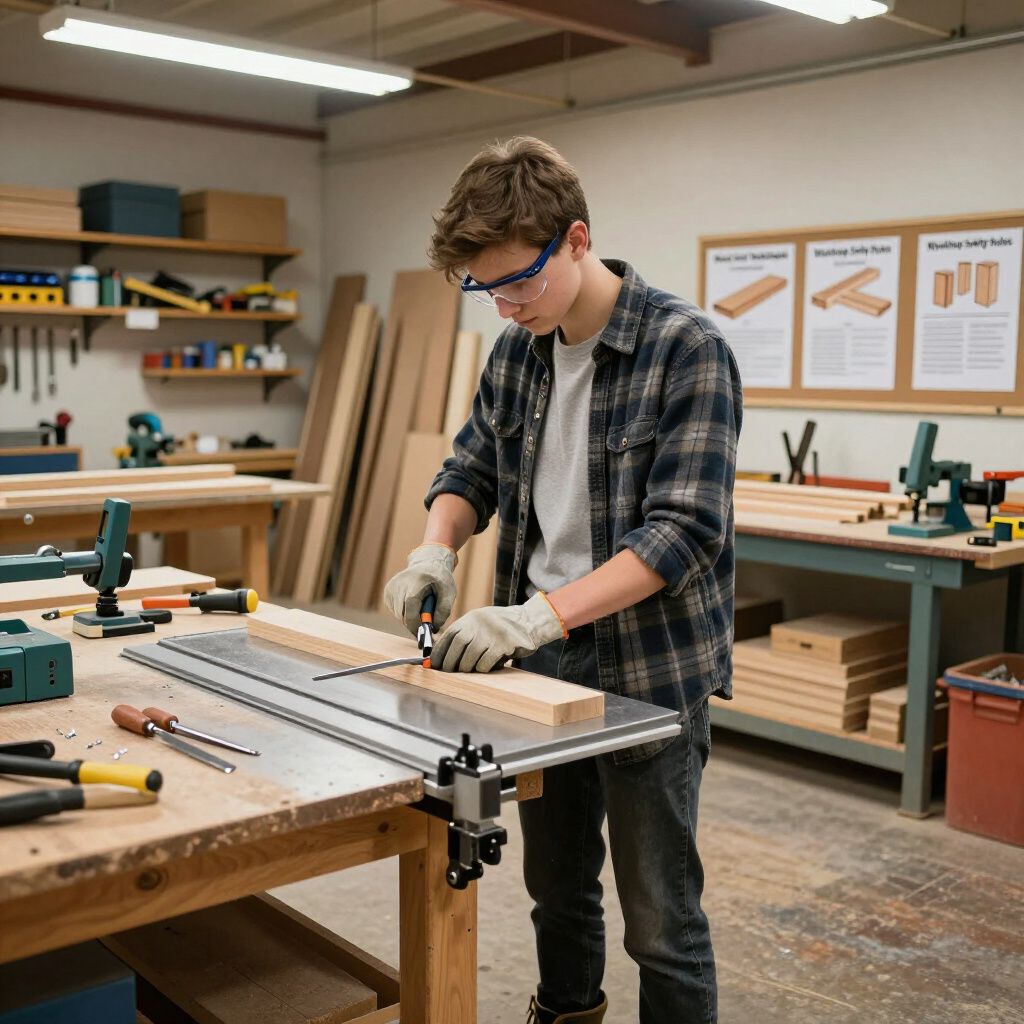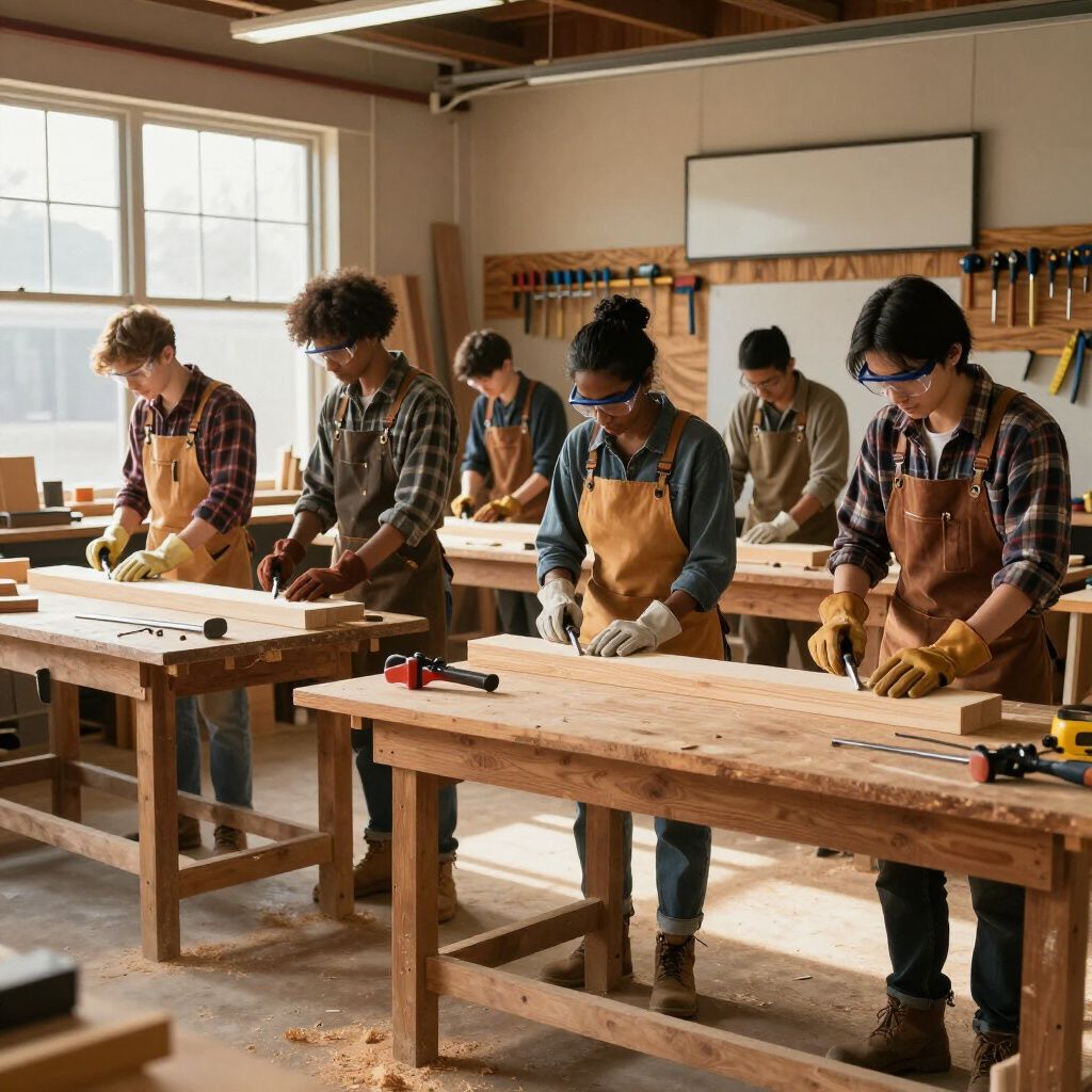 Students work with professional-grade saws, drills, and woodworking benches, gaining practical skills in crafting, measuring, and assembling wood projects under expert supervision.