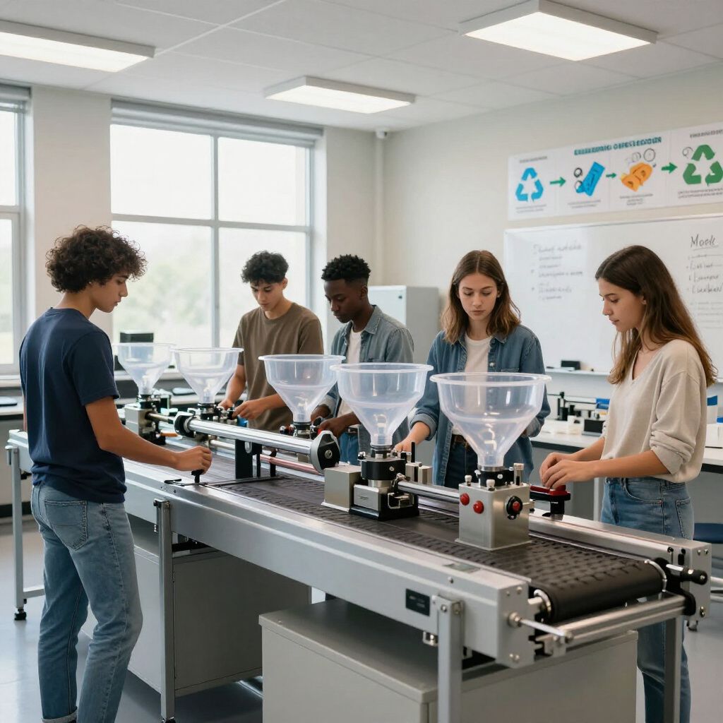 Our recycling lab provides machinery for sorting, shredding, and molding plastics, enabling students to learn the full cycle of technical plastic processing and sustainable waste management.
